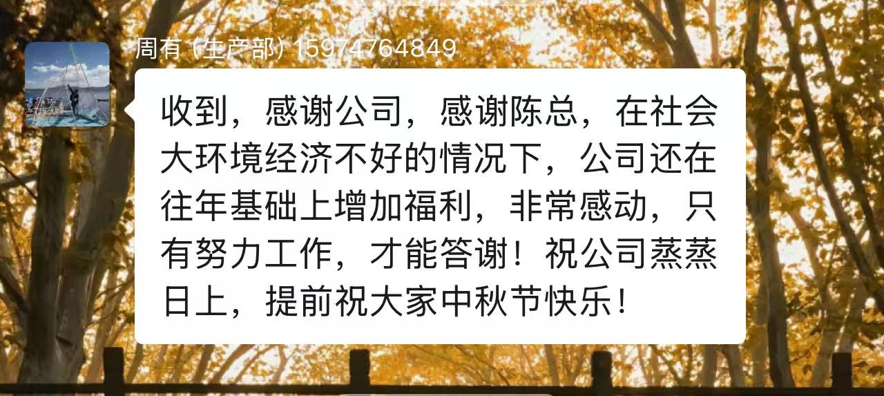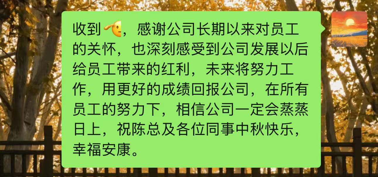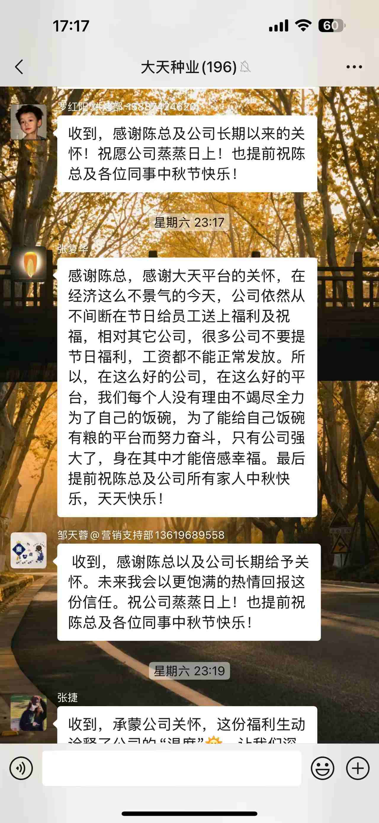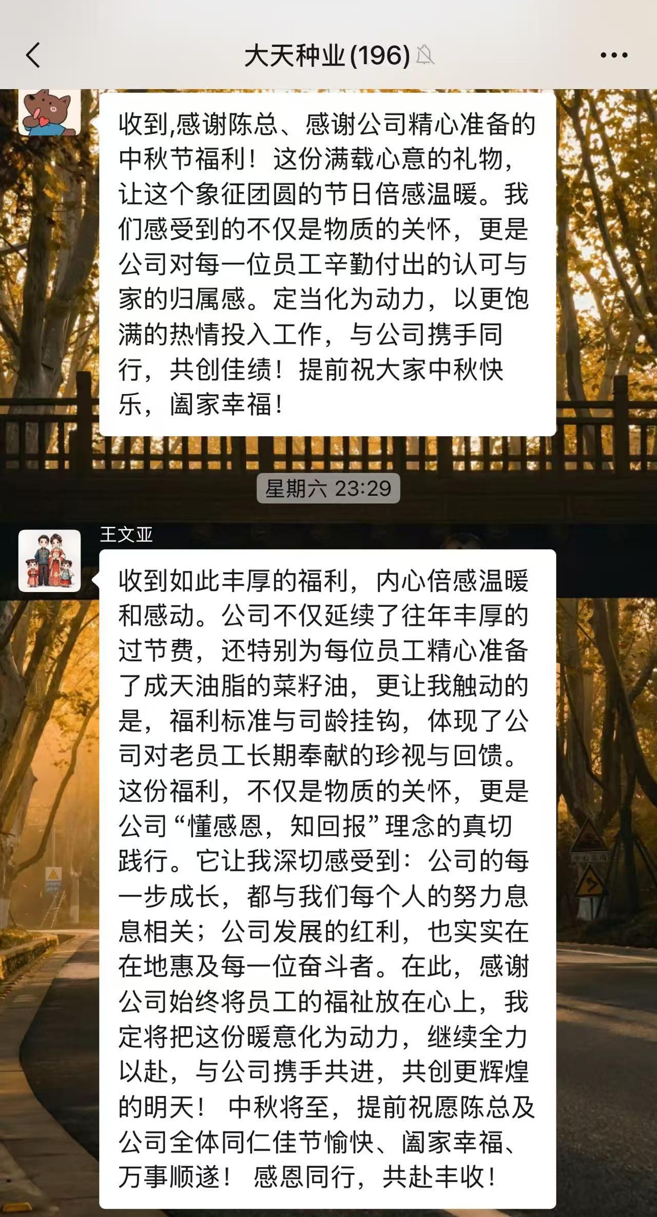 金秋送爽,丹桂飄香。云南大天種業(yè)以實實在在的福利傳遞企業(yè)對員工的深切關(guān)懷,進一步增強了團隊凝聚力和員工歸屬感。未來,公司將繼續(xù)秉持“以人為本”的管理理念,與全體員工攜手共進,共創(chuàng)更加美好的明天。